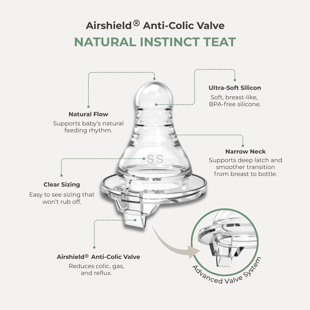 Each teat is equipped with our advanced AirShield® Valve, a unique system that actively vents air back into the bottle, not your baby’s tummy. You’ll see it working in real time: visible air bubbles rising inside the bottle as your baby feeds, a sign the valve is actively reducing vacuum buildup and helping prevent colic and post-feed fuss.